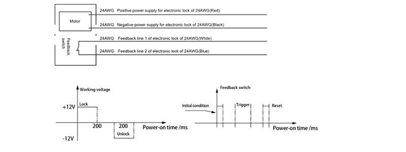 | Positive power supply with voltage of 12V Red line | GND Black line | Electronic lock condition | Feedback switch condition |