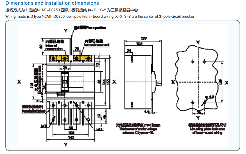 • Tested: ultimate short circuit breaking capacity Icu of 25kA according to IEC 60947-2, NCM1-DC250 PV 2P DC500V/4P DC1000V specialized in Molded Case Circuit Breaker dc circuit breaker