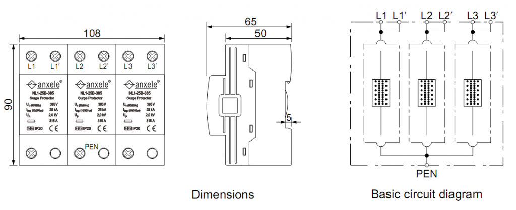 Lightning impulse current (10/350μs) [L, N-PE] (Iimp) | 25 kA |