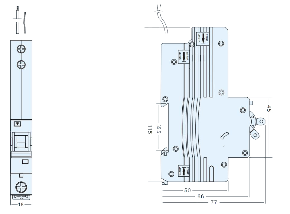 Terminal size top/bottom for busbar: 16mm2 18-3AWG