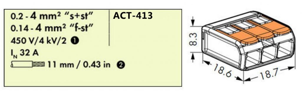 The 2-, 3- and 5-wire connectors accommodate fine-stranded wires from 0.14 to 4 mm2, as well as solid and stranded wires from 0.2 to 4 mm2. This wide range allows you to connect different types of wires and enables bridging of wires with greatly differing cross sections.